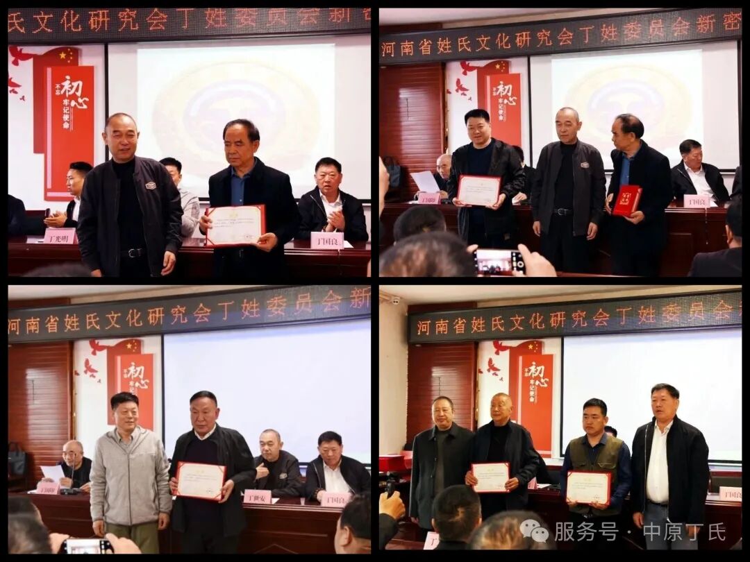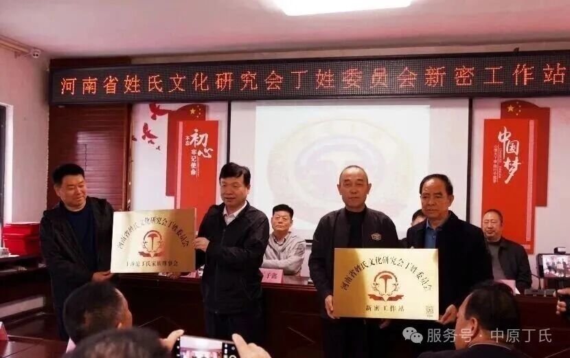 随后,丁世安会长、丁子鑫执行会长等省丁姓委员会领导,依次为河南省姓氏文化研究会丁姓委员会新密工作站、丁滹沱丁氏家族理事会正式授牌颁发证书,标志着两大机构正式成立,启动运行。