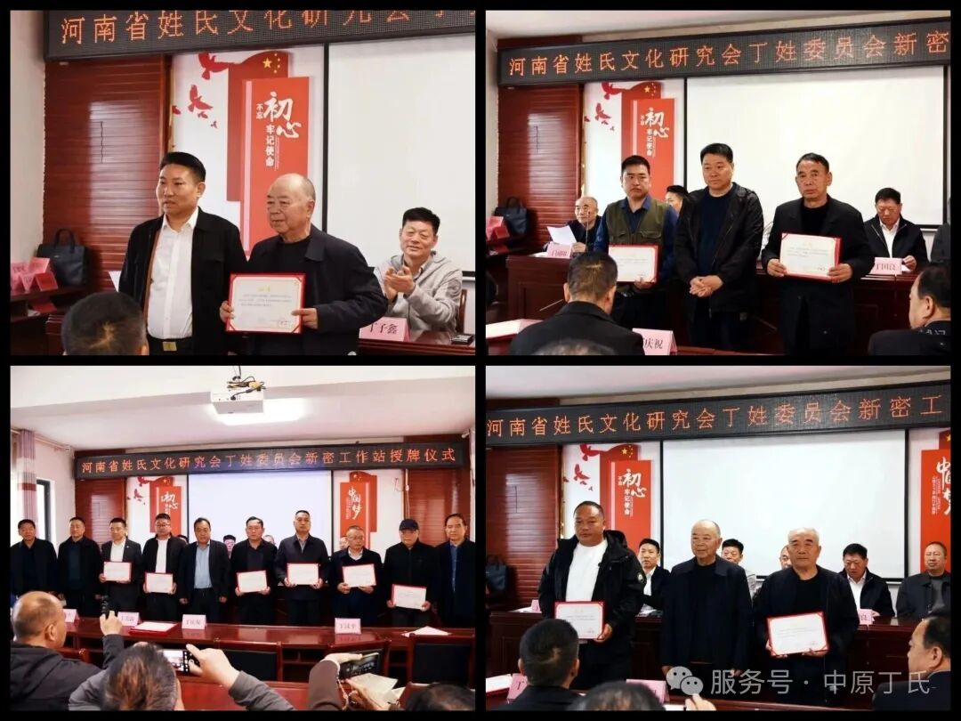 随后,丁世安会长、丁子鑫执行会长等省丁姓委员会领导,依次为河南省姓氏文化研究会丁姓委员会新密工作站、丁滹沱丁氏家族理事会正式授牌颁发证书,标志着两大机构正式成立,启动运行。
