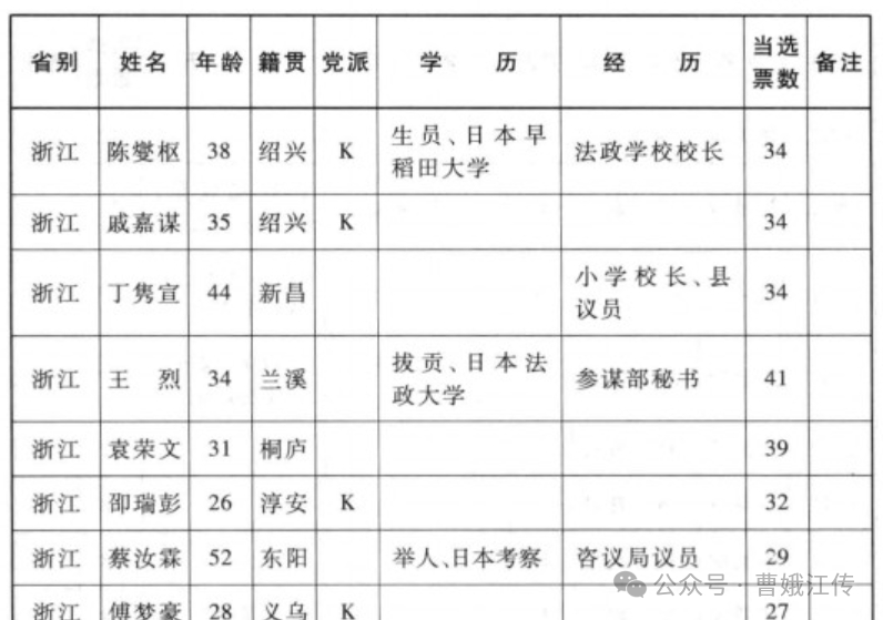 因丁隽宣组织民团平定“兴善寺造反”有功,被时任浙江都督的朱瑞委任为新昌民团局局长,旋被选为县众议院议员,后又被选为第一届国会议员。据传,他与张载阳为结拜兄弟,今天无法证实,但从情理上推测,这种可能性完全存在,当时杭州政界的新昌人屈指可数,丁隽宣出道早于张载阳,年长其五岁,张载阳甚至可能得到丁的支持。根据张朋园(2013)研究,1913年第一届国会议员,浙江籍的议员一共只有36人。虽然国会后来被袁世凯解散,但当时能够被推举为国会议员,都是地方上的精英。